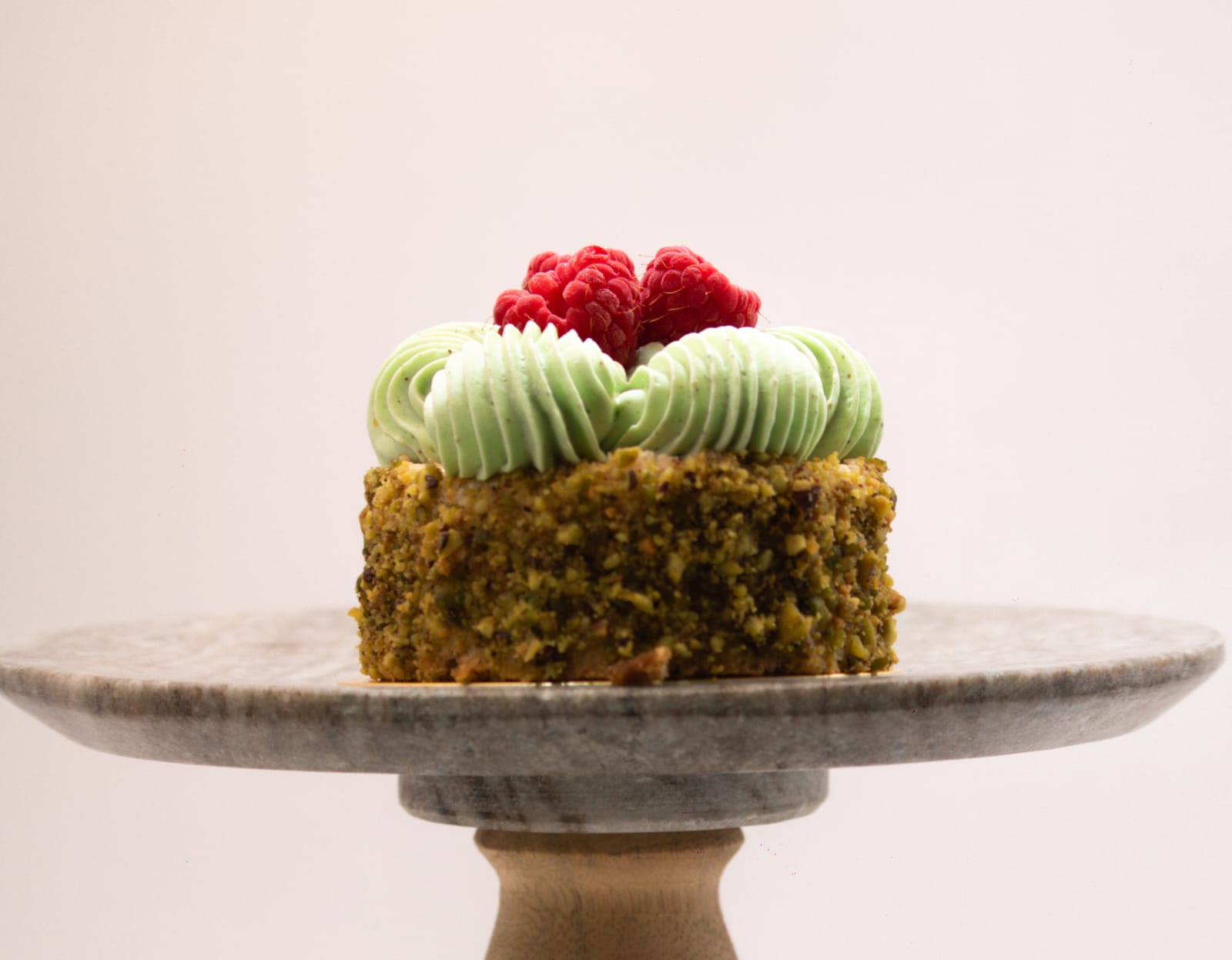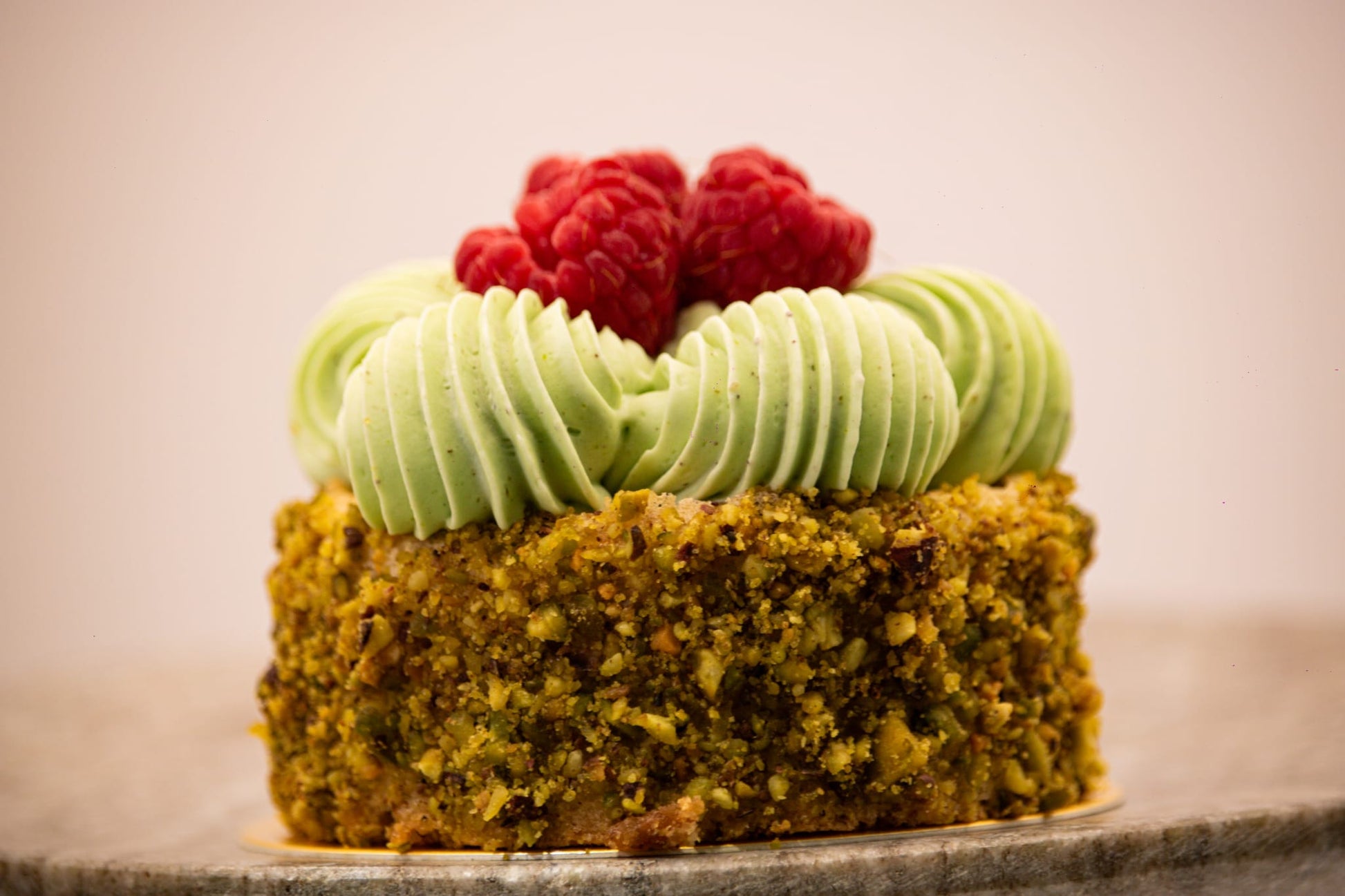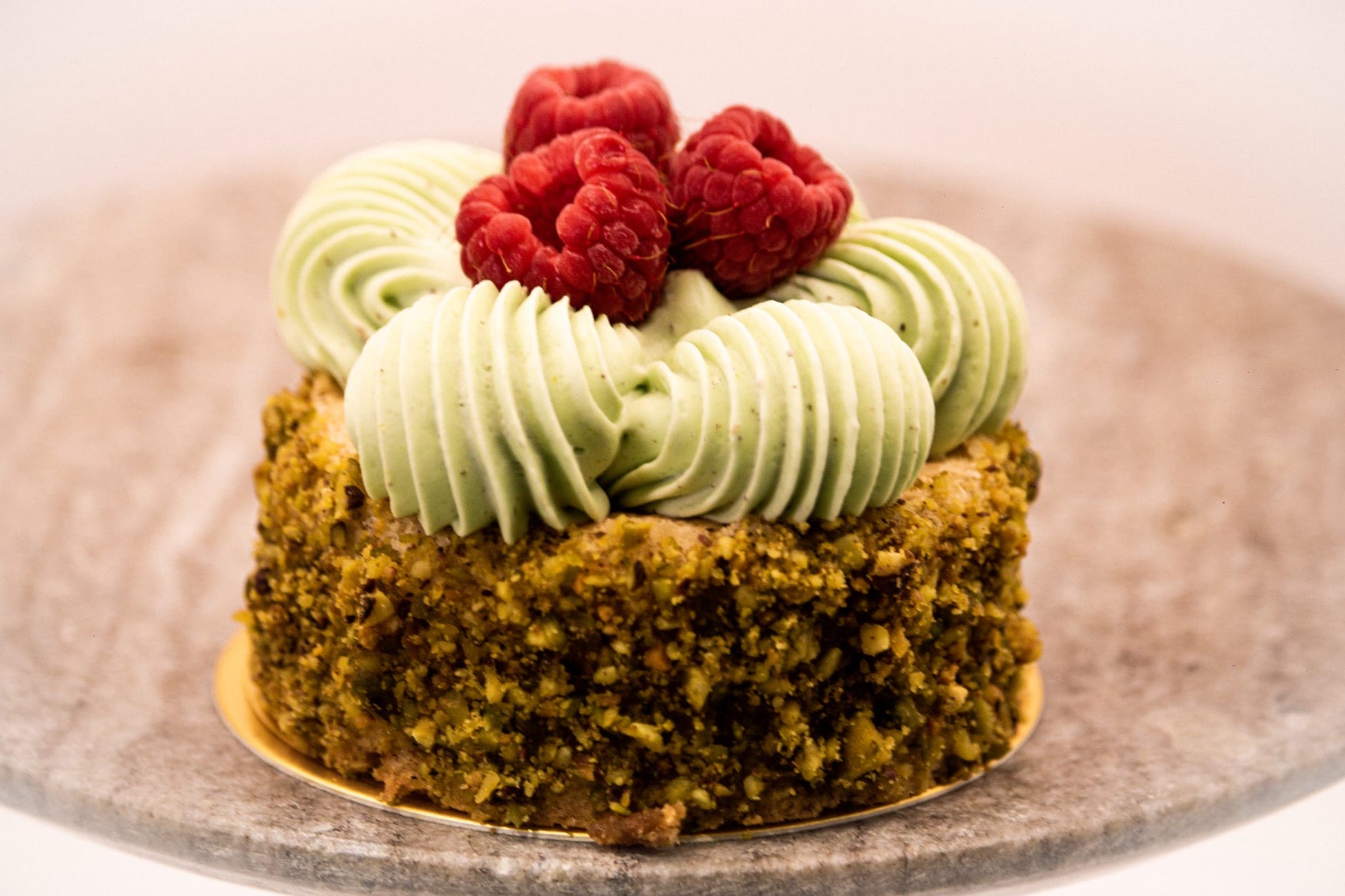 A very soft gluten-free cake made with pistachio and almond, topped with pistachio ganache montée and fresh raspberry.